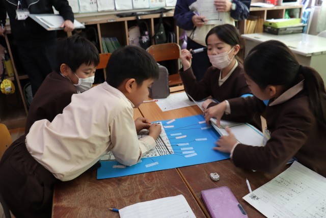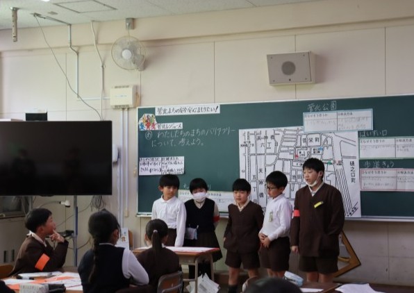 私たちが住む菅北校区。今一度よく見ていて、お取り寄りや子どもたちなど様々な人のバリアはないだろうか考え、解決方法をみんなで話し合いました。道路の狭さや点字ブロックがないところ、自転車がたくさんあるところなどたくさん見つけており、「目の不自由な人が危ない。」「自転車が倒れてきたらケガする。」など意見が出ていました。わたしたちの住む町がより安全安心に過ごすにはどうすればよいのか、引き続き学習していきます。