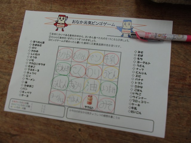 5年生は、腸の働きや栄養バランスの良い食事について学びました。おなか元気ビンゴ大会を通して、普段の食生活を振り返り、バランスよく食べることの大切さについて学びました。
