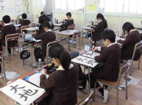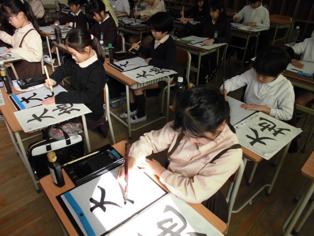 2学期最後の習字をしました。今まで画数が少ない漢字は小さめに書くことや左右の部分を組み立てるときは、左の幅を小さくし場所をゆずりあってかくことなどを学習してきました。大地という漢字は、今まで学習してきたことを活かして書く学習のまとめのような字です。ポイントを確かめた後、子どもたちは今まで以上に集中して取り組んでいました。