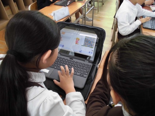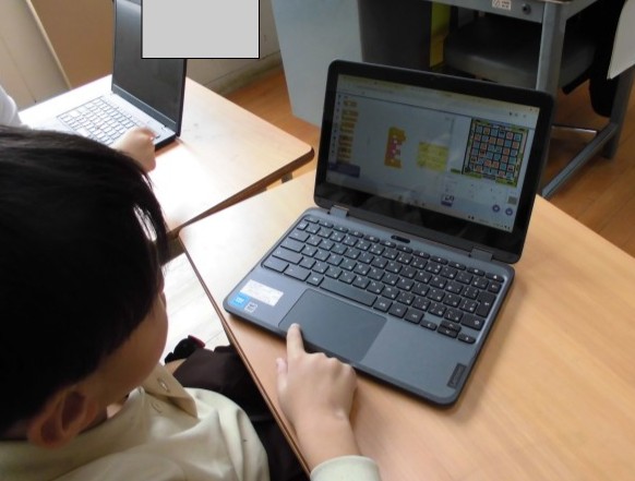 今回行ったプログラミングは、レーシングカーを走らせてコインやタイヤなどのアイテムをとるものです。指定されたアイテムを取るためには、車にどのような命令を出すと良いかを考えました。友だちと行ったり発表をしたりすることで、命令の組み合わせ方は一つではないことを知り、「友だちの方法もやってみたい!」と積極的に取り組む姿が見られました。