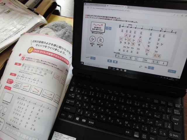 デジタル教科書のソフトを使って、音階を決めて再生し、自分が心地よいと思う日本風の音楽を作りました。