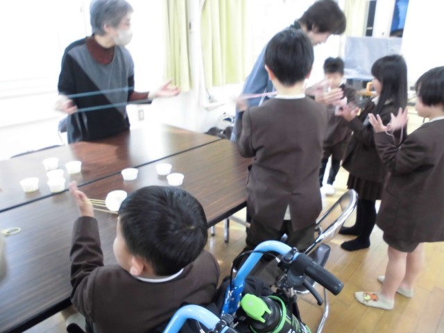 けん玉、お手玉、あやとり、こま、めんこの5つの遊びをしました。