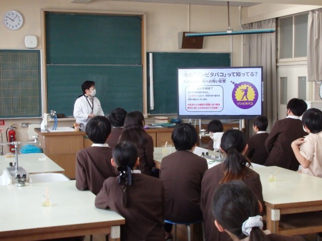 学校薬剤師の三宅先生に来ていただき、6年生で「くすりの正しい使い方講座」を実施しました。薬に関する知識や正しい使い方について学習し、薬を服用する際にどうして水で飲まなければならないのかを実験を通して学ぶことができました。さらに、違法薬物の所持や使用の低年齢化が問題視されている現在において、薬物乱用の未然防止の啓発となるお話もしていただき、正しい知識を得ることができました。最後にタバコの害についても学習しました。