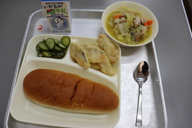 今日の給食の献立は、黒糖パン・白身魚のフリッター・スープ煮・きゅうりのピクルスです。