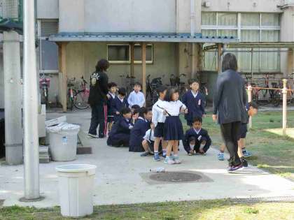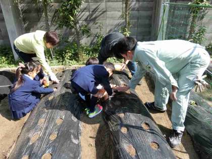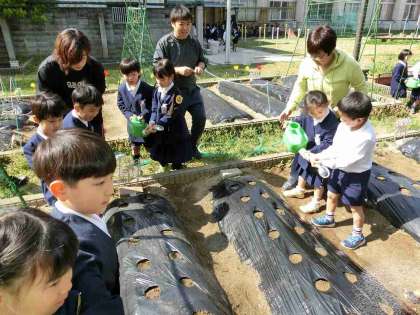 1年生が1時間目に初種まきに挑戦!多くの先生方が駆けつけ、お手伝い!無事にオクラとインゲンの種まきが終了しました!