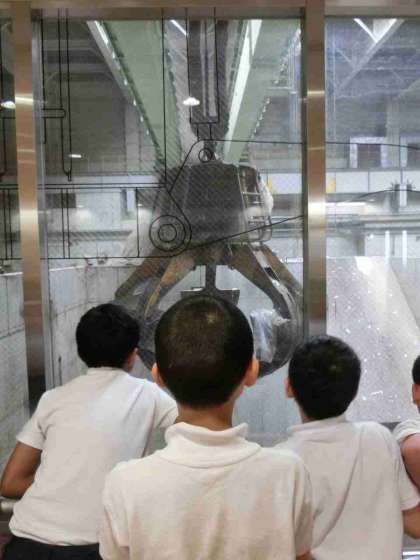 ゴミをつかんで焼却炉に運ぶクレーンや各所にある見学スペース、クイズを楽しむシアターなど、子どもたちは興味津々で見学していました。