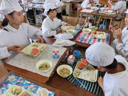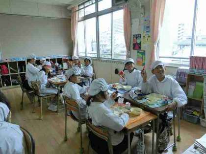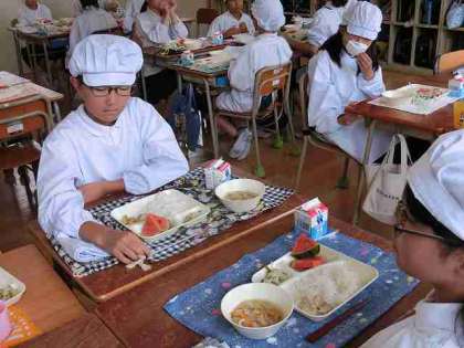 収穫したスイカは、6年生は給食時に、4年生は社会見学(科学館見学)からの帰校時に試食し、食育の取り組みを行ないます♪(写真は6年生の様子です)