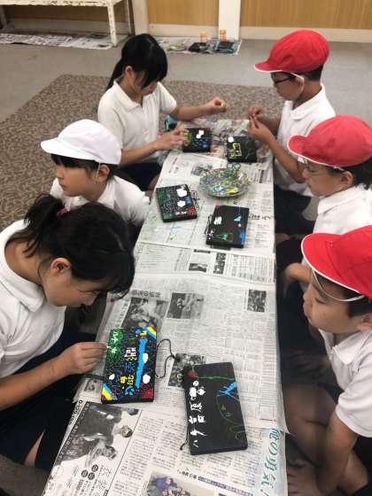 みんな一生懸命焼いた木の板をこすって、出た模様に思い思いの絵や文字をペイントして、味わいのある作品に仕上げました。