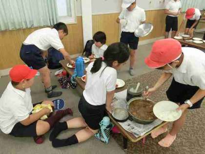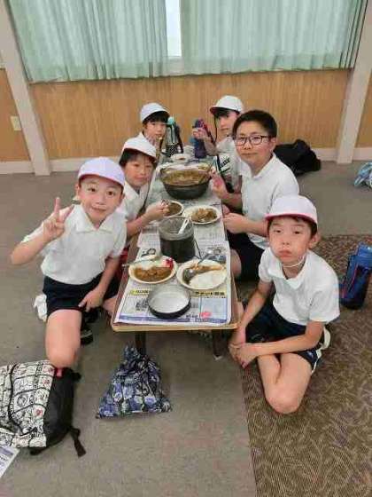 この日のために学習園で栽培した「ナス」「インゲン」「カボチャ」そして「ピーマン」を現地に持ち込み、夏野菜カレーにしました!