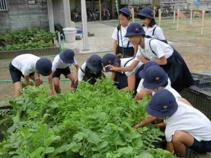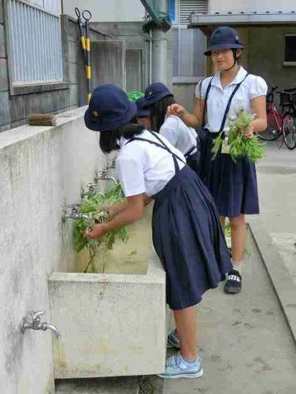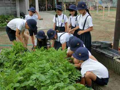 2学期当初に各学年で秋・冬野菜の植え付けを行ないましたが、早くも10月3日、4年生が「ミズナ」の収穫となりました、収穫後は「お浸し」にして食育を楽しみました!