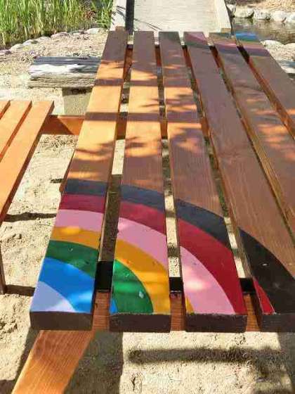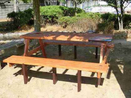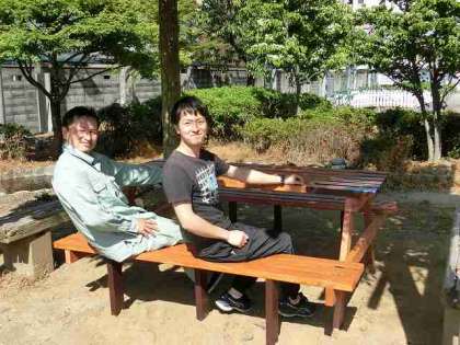 老朽化が進み、かなり傷んでいました。そこで管理作業員さんや先生方が、新しいベンチテーブルを作成し、完成しました!手作りで天板には美しい塗装もあります!