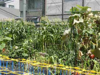 上:農園の全景です(6月24日現在)正面に約170cmほどに成長したトウモロコシが見えます。先端の傘のホネのように見えるのが、トウモロコシの「雄花」です!