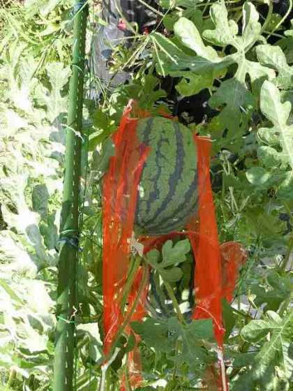 中:6年の中玉赤スイカ、バレーボール大の大きさです。落下防止にネット(赤色)で吊り下げています。およそ4kgはあります!