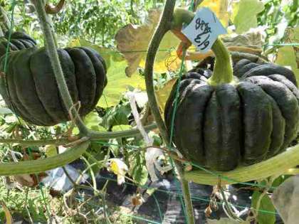 下:5年生の日本カボチャです、直径15cmほどに成長しています、あと10日ぐらいで収穫かな?