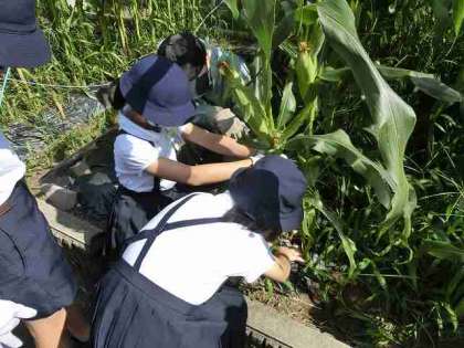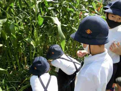 6月29日、梅雨の合間の晴天です、3年生が、全校朝会の後、トウモロコシの収穫を体験しました。剪定はさみで太い茎を切り、収穫します。悪戦苦闘でした!
