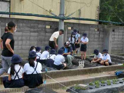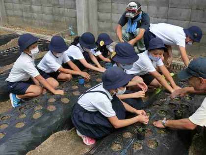 始業式後の2時間目に、学校のトップバッターとして、3年生が「青首ダイコン」と「五寸ニンジン」の植え付けを行いました!順調にいけば、ダイコンは10月下旬、ニンジンは11月下旬に収穫となります!