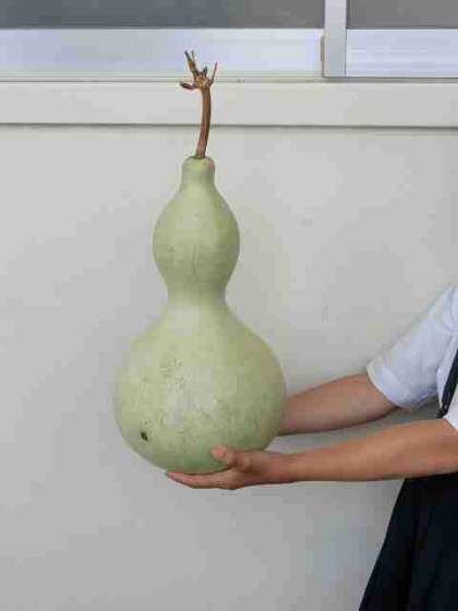 品種は「大ヒョウタン」でヒョウタン中最大の大きさになります。ちなみに今回収穫の大ヒョウタンは、長さ(高さ)が約40センチ、最大部の太さ(胴長)が約65センチでした!
