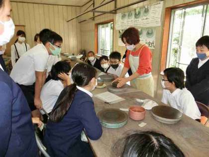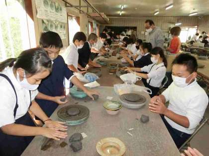 学校を出発後、草津PAを経由し、およそ1時間半で滋賀県信楽の「宗陶苑」に到着しました。まずは、ここで信楽焼の作陶体験です!