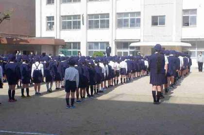 4/19(月)今日の全校朝会も、運動場で隣との距離をとりながら行いました。