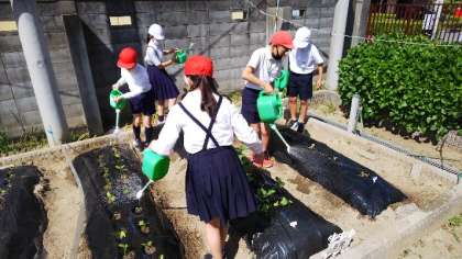 4月22日(木)5限目、学習園において、インゲン豆、なすび、カボチャの苗を植えました。できた野菜は、林間学習時にいただく予定です。おいしくできますように!