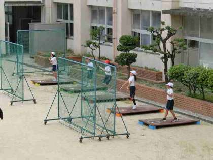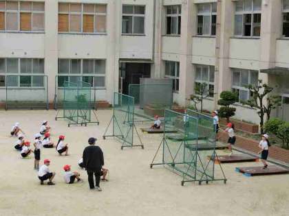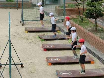 早速、3年生が体育の時間で使ってくれていました。先生の指示で、全員が列に並んで順番に跳んでいました。跳んでいる子どもたちもうれしそう!