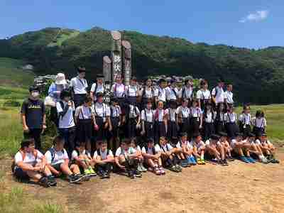 午前11時30分、開所式終了後、宿舎の手前の高原で記念写真を撮りました。背景は鉢伏山、頭の上は抜けるような青空。とてもいい天気です!