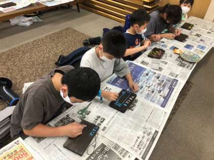 焼いた杉の板をもらい、しっかりこすって木目を出して、ペイントして仕上げます。さあ、どんな作品ができるかな?お家の人には、帰ってからのお楽しみです(^^)/