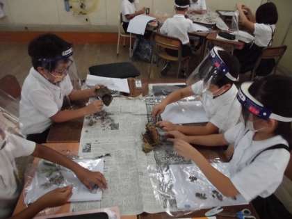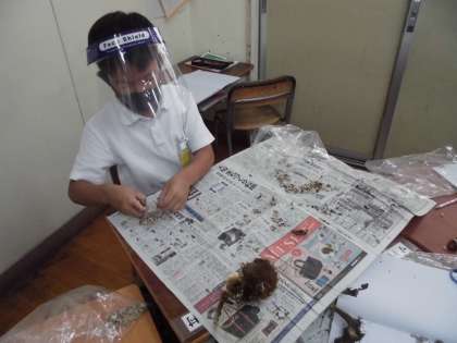 理科の時間に、春から育てていたヒマワリの種の数を数えました。種は1つ1つ別々の部屋にできていることがわかりました。ピンセットを使って、丁寧に取り出したり、虫眼鏡を使って、種や花の様子を詳しく観察しました。子どもたちは、1つの花から1000個以上の種ができることが分かり、驚いていました。