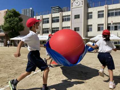 晴天の下,紅白の帽子を被った子どもたちが元気に駆けていきます。