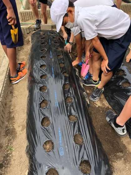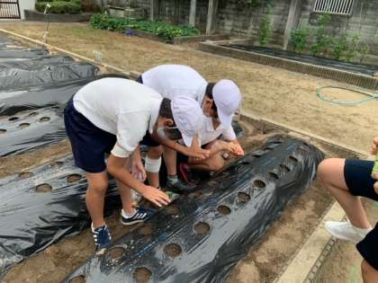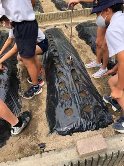 先週の火曜日(9/7)6時間目に、聖護院ダイコンの種植えをしました。それに先立って、畝に張っているマのルチに有志の児童が穴あけをしてくれました。そのおかげで、スムーズに種植えを終えることができました。成長が楽しみです。
