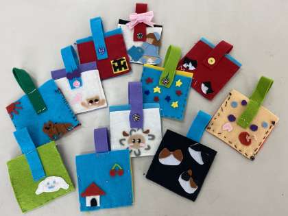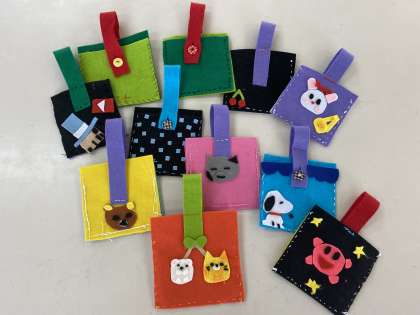 そして、初めての作品が完成しました。「マイ ミニバッグ」です。飾りもたくさんつけて、みんな素敵に仕上がりました。