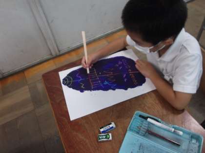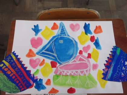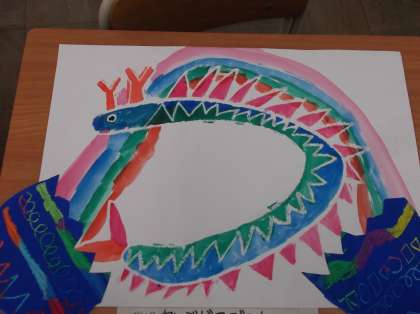 さらに、たまごから生まれたふしぎないきものを、白のクレパスで描いていきます。水をたっぷりふくんだ絵の具を塗ると、クレパスの線が見えてきて…ふしぎないきものがあらわれました。