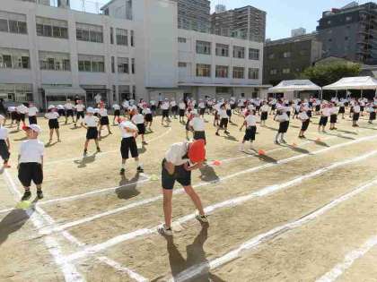 指揮台に上がった3年生の動きに合わせて、みんな、しっかり体を動かしていました。