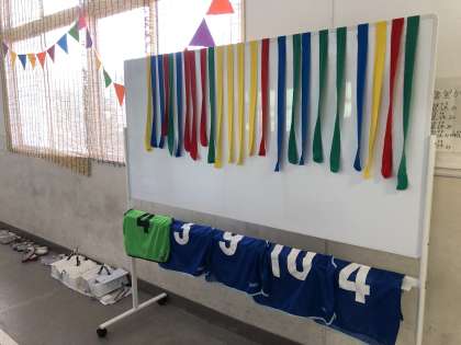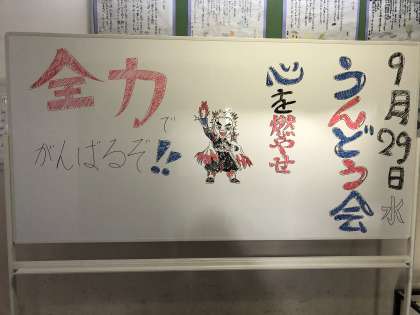 昨日(9/29)は「運動会、全力でがんばるぞ!」と書かれていたホワイトボード(上写真)には、洗濯後のゼッケンと鉢巻が干され(中写真)、たくさんのテントや用具が並んでいた運動場はすっかり片付いていました(下写真)。