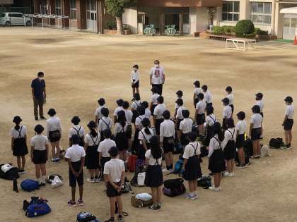 10/5(火)、修学旅行出発の日。集合時刻のずっと前から、玄関で待っている子がいました。その後、続々と集まってくる6年生の子どもたちの顔は、みな笑顔で、今日の日を楽しみにしていたことがわかります。
