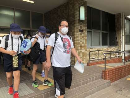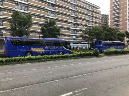 7時44分、学校出発。その後、バスに乗り込みますが、新型コロナ対策の為、2台のバスに分乗するので、担任の松田先生が2台のバスを行き来して、丁寧にチェック。