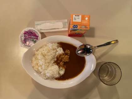 12時ちょうどに昼食です。カレーライス、オレンジジュース、グレープゼリーです。