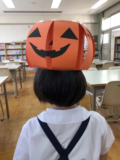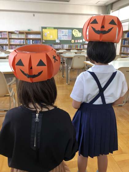 ハロウィンを前に、カボチャの妖精が図書館にやってきました!大人と子どもの2人です。(ちなみに大人のカボチャは越智先生です)