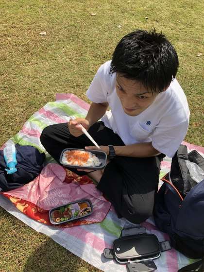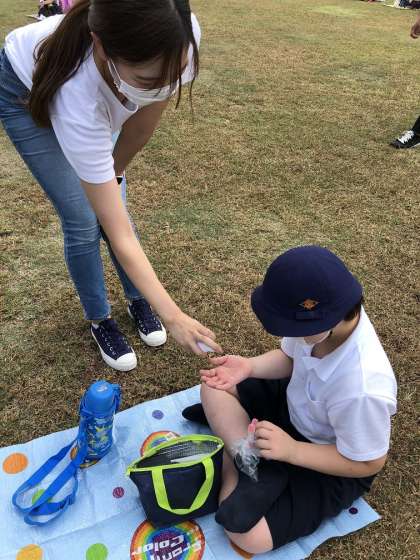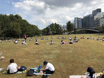 『こども本の森 中之島』から歩いてすぐの中之島公園の広場で、昼ご飯を食べました。3年生が真ん中で円形に座り、その周りを4年生がぐるっと二重の円を描くように座って昼ご飯を食べました。