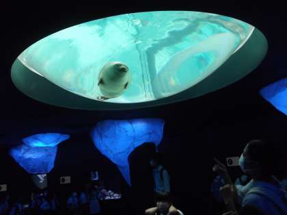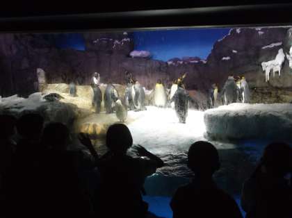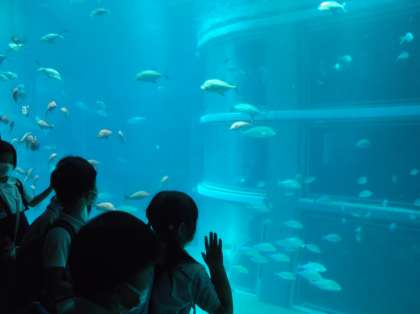 海遊館では,おなかに顔があるように見えるエイをはじめ,たくさんの魚たちがお出迎えしてくれました。ペンギンやクジラ,タカアシガニやアザラシなど,水族館でしか見られない生き物がたくさん見られ,みんな大喜び。暗い館の中でも笑顔がたくさん見られました。