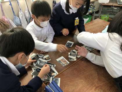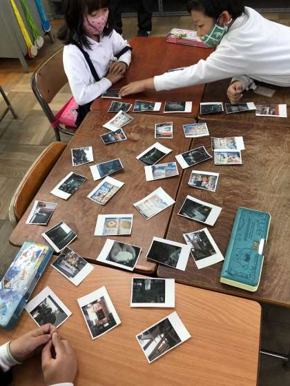 自分たちで撮った写真を「町たんけん」で訪問したお店ごとに分けて、その中から自分の気に入った写真を1枚ずつ選んで名前を書き、まとめのカードに聞いてきた内容の説明の文を書きました。