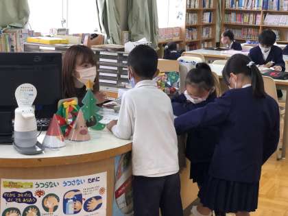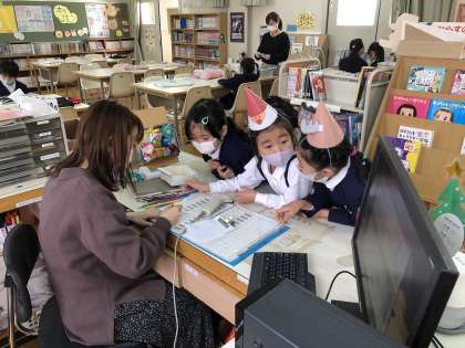 1年生が「しぜんの本ってありますか?」と尋ねたら、「どんなしぜんが知りたいの?」と聞いてくれて、「どんぐりとか・・・おちばとか・・・」と答えると、すぐにお目当ての本を探してくれます。