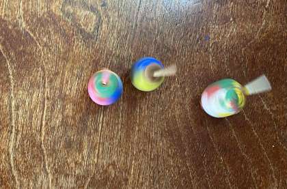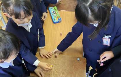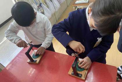 休み時間には、自分で作ったコマを楽しそうに回して遊んでいました。すぐに回すコツをつかんで、長い間まわせる子もいました!