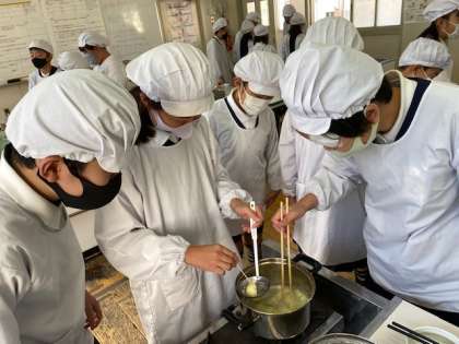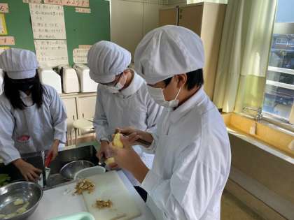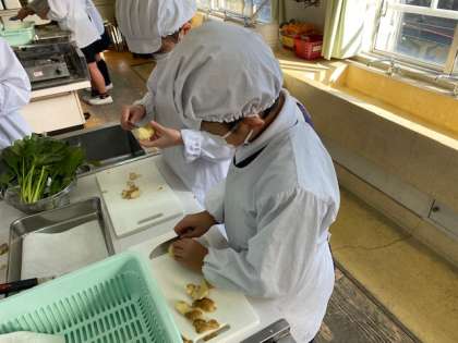 初めての包丁を使う実習で、しかも皮をむくというなかなか難しい作業でしたが、「こわいなぁ。」と悪戦苦闘しながらも、がんばって取り組んでいました。