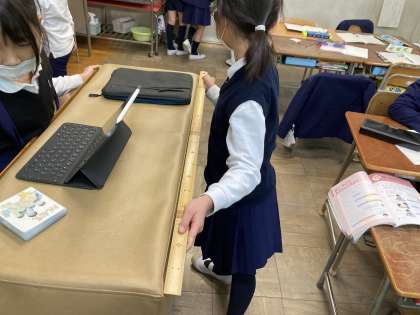 長いものの長さを測る道具として,1mものさしを紹介しました。下の写真は,子どもたちが1mものさしを使って,身の回りのものの長さを測っている様子です。