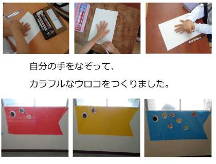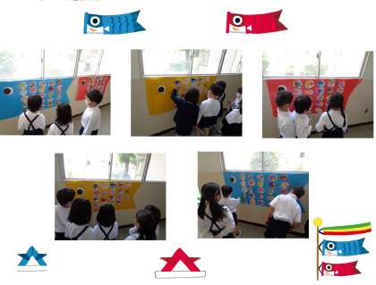 5月5日の「子どもの日」に向けて、教室前廊下に、大きなこいのぼりを作りました。