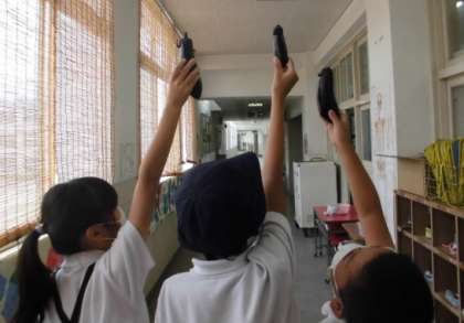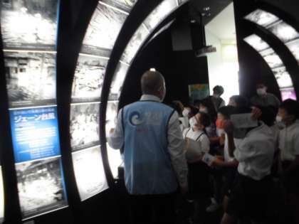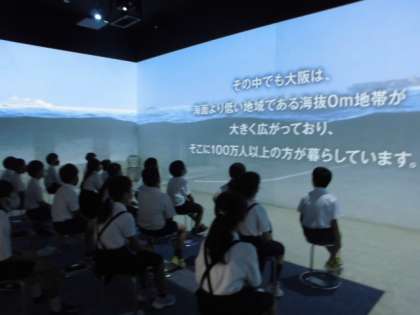 最初の行き先は、津波高潮ステーションです。施設の方に、地震や津波の時の対応について教えていただきました。三面がスクリーンになっている部屋では、津波が自分の方に迫ってきたり、床が揺れたりする体験をしました。疑似体験を通して、自然災害の恐ろしさを子どもたちは感じられたようです。もし、自然災害が起こったら、自分がどのように行動しなければいけないのかを一人一人がしっかりと考えておくことが大切だということがわかりました。