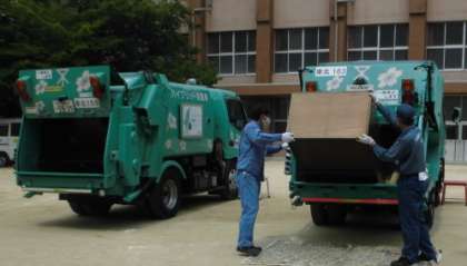 2台のパッカー車が学校にやってきました。左のパッカー車と右のパッカー車、見た目は同じように見えるのですが、粉砕する仕組みのものと、あまり細かくせずパッカー車の奥に詰めていく仕組みのものとがあるそうです。