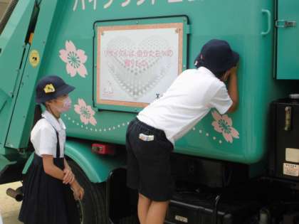 実際に、タンスが粉砕されていく様子を見ました。大きかったタンスがあっという間にパッカー車の中に入っていく様子に、子どもたちは驚いていました。
