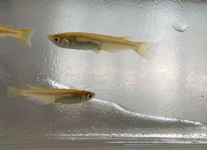 5年生で学習するメダカが、理科室にやってきました。めす、おす合わせて約30匹。